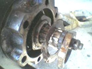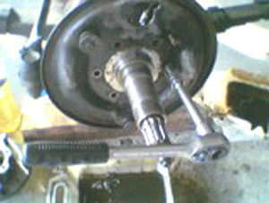 Próximo passo: Descobrir a folga da roda esquerda. Início da desmontagem do cubo frente / esq. Depois de raspado e limpo com bastante gasóleo... Nesta fase é importante ter duas coisas à mão: panos de limpeza e gasoleo com fartura