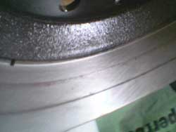 Detalhe do tambor dos travões: Depois de ir ao torno, retirou-se os sulcos que estavam a originar uma má travagem. A área que foi acertada aparece em cinza claro (metal). Nunca pintar esta área pois é aqui que os calços actuam. Esta acção deve ser feita tendo em conta que existe um limite ao que se pode retirar. Há uma espessura mínima a respeitar.
