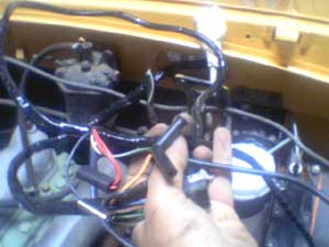 A fotografia pretende demonstrar que esta é uma operação confusa. Existem muitos cabos electricos, muitas cores semelhantes, e muitas medidas diferentes. Isso não é um mero acaso! Ficam algumas dicas: Quando se refere alguma conjunto de cores, a primeira é a cor geral do cabo e a segunda é o traço. Ou seja, se o manual diz "RG" isso significa "Red and Green", na prática um fio eléctrico vermelho com risca verde. Para além disso existem as variantes "LG", ou seja "light green" que é como quem diz, verde claro.