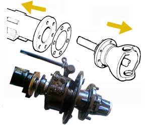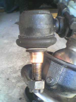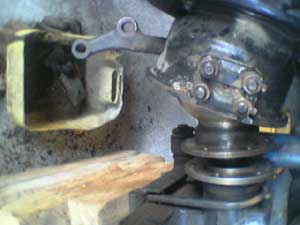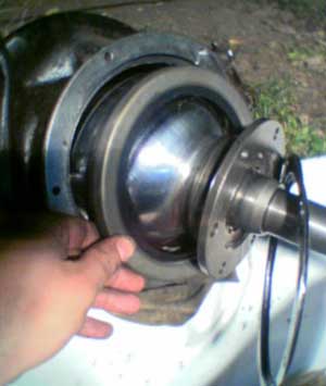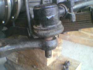 Já que mexi na transmissão da roda da esquerda, resolvi mexer também na da direita. A operação tinha três objectivos: Mudar o retentor, verificar se era possível retirar a pequena folga no pino da rótula e uma operação de limpeza e pintura. A manutenção do sistema de travagem já estava feito (excepto montar claro). É claro que para tal não necessitava de desmontar tudo (como fiz na direita) e como tal o objectivo foi desmontar o eixo pela junção à rótula (como se vê na foto).